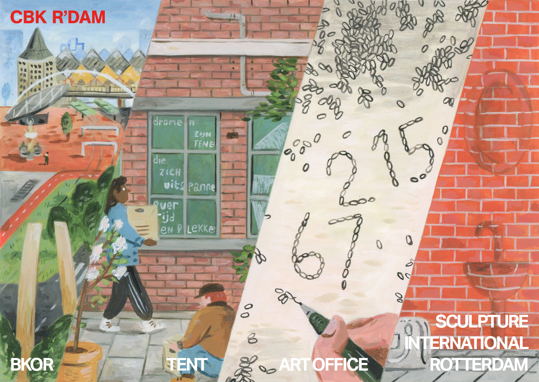 CBK Rotterdam wenst iedereen een voorspoedig 2026! Met opnieuw een bijzonder jaar achter de rug hebben we de Rotterdamse kunstenaar en illustrator Kazuma Eekman gevraagd een werk te maken dat vier belangrijke mijlpalen in beeld brengt. Zo bracht BKOR maar liefst 20 kunstwerken en 19 bouwwerken uit de Post65-periode samen in de nieuwe Kunstroute Rotterdam, van metrostation Beurs naar Stadhuis. TENT sloot in 2025 haar deuren aan de Witte de Withstraat om vervolgens een spannend nieuw hoofdstuk te beginnen in een voormalig laboratorium aan de Coolhaven. Art Office heeft het recordaantal van 215 Praktijkbijdragen en 67 I&V-subsidies toegekend aan Rotterdamse kunstenaars. En Sculpture International Rotterdam had het jaar niet mooier kunnen afsluiten dan met de onthulling van het kunstwerk A Minute of Shelter van Narges Mohammadi op de Coolsingel.